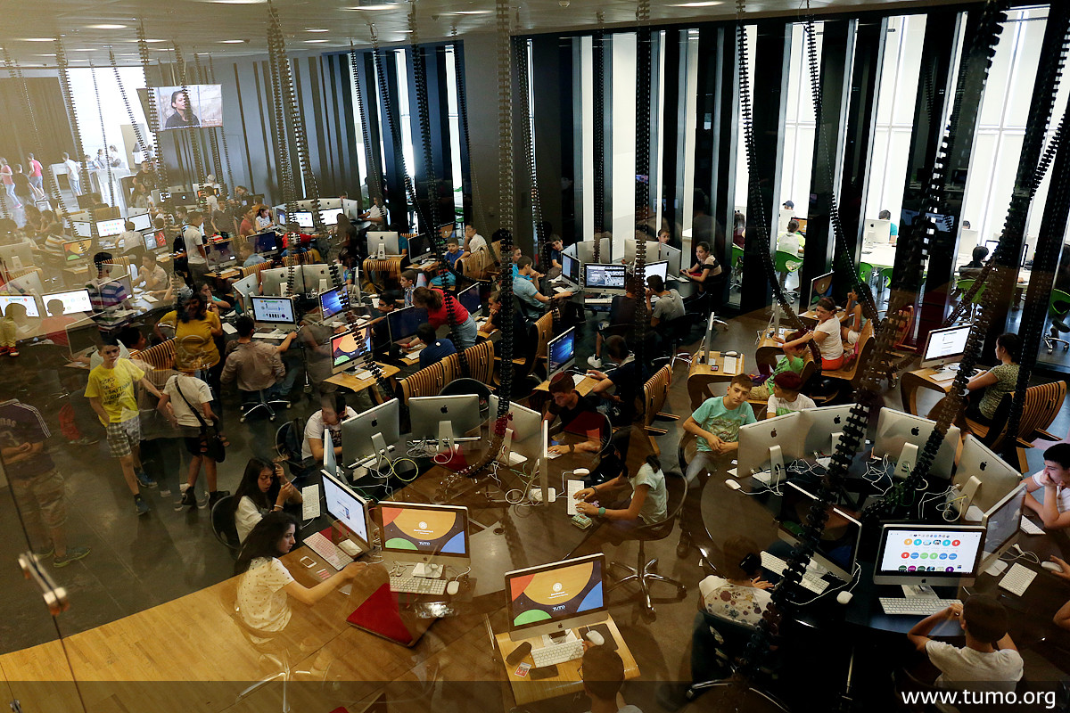 Keineswegs nur von seinem schieren Platzausmass her eine absolut revolutionär zeitgemässe Aus- und Weiter-bildungs-Stätte: Hier lernen bislang rund 2’000 Kinder und Jugendliche völlig umsonst über Hundertschaften an i-Mac-Hardware mittels digitaler Software-Medien Animation, Programmierung, Filmerstellung, Robotik, die Entwicklung von Spielen, Grafikdesign sowie vor allem auch elektronische und analoge Musik und vieles mehr! Die Studenten von Tumo schreiten mit ihrer Aus- und Weiterbildung aufgrund ihrer individuellen Präferenzen und im von ihnen selbst für optimal befundenen Tempo fort. Innerhalb dieser flexiblen Rahmenstruktur arbeiten sie auf höchst spezifische Lernziele hin. Mitglieder von Tumo werden von Beginn weg dazu ermutigt, vorerst auf alle vier Basis-Disziplinen wie Animation, Spiele-Entwicklung, WebDevelopment und digitale Medien zu fokussieren. Vom Moment ihres individuellen Fortschritts mit den Bildungsinhalten an, sollen sie sich jedoch von den in den vier Sparten zunehmend herausfordernden Projekten auf eine derselben konzentrieren, um damit auf die Vollendung des finalen Projektes innerhalb des zweijährigen Lern-Zyklus hinzuarbeiten. Zusätzlich zur Instruktion im selben Haupt-Fokus, deckt der Studienplan ein Set an unterstützend technischen, künstlerischen und professionellen Kompetenzen ab. Diese beinhalten Computer-Programmierung, 3D- Modellierung, 2D graphics, Zeichnen, Sounds, Schreiben, online-Literatur und Kommunikation.