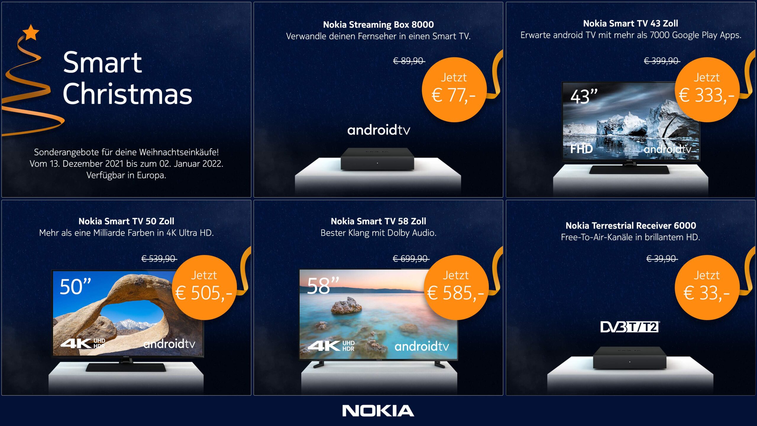Vom 13. Dezember 2021 bis zum 02. Januar 2022 feiert die StreamView GmbH, Lizenznehmer der Marke Nokia für Smart TVs und Set-Top-Boxen, Bescherung für TV- und Streaming-Fans. Im Geschenkesack warten eine Vielzahl von Online-Schnäppchen für Nokia Smart TVs, die Nokia Streaming Box und den Nokia Terrestrial Receiver. Wer in der Weihnachtszeit noch auf der Suche nach Last-Minute-Geschenken ist, sollte im Online Shop zuschlagen und sich schnell entscheiden.