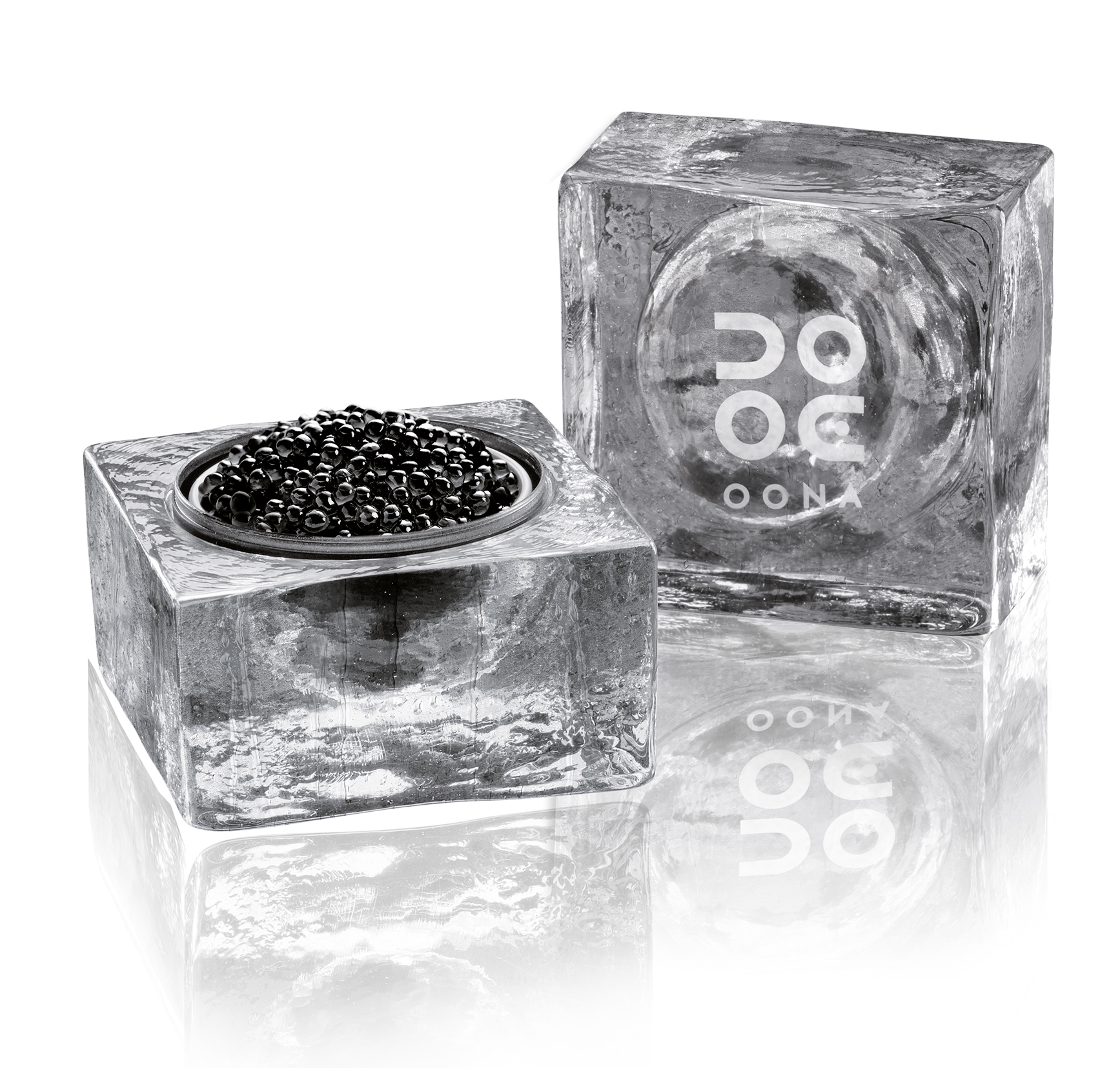 Eine exklusive Verpackung gebührt diesem edlen Produkt; weshalb OONA Kaviar eingebettet in einem ICE CUBE der bekannten GLASI Hergiswil als Unikat in Erscheinung tritt. Aus klarem Glas gefertigt, symbolisiert dieser Kubus die Reinheit des Produktes und nimmt die Philosophie der Nachhaltigkeit im Material auf. In Form einer Kugel findet der Kaviar als Abbild einer perfekten Perle inmitten des Kubus seinen Platz. Innerhalb der Kugel hält ein raffiniertes Kühlungssystem die Idealtemperatur des Kaviars.