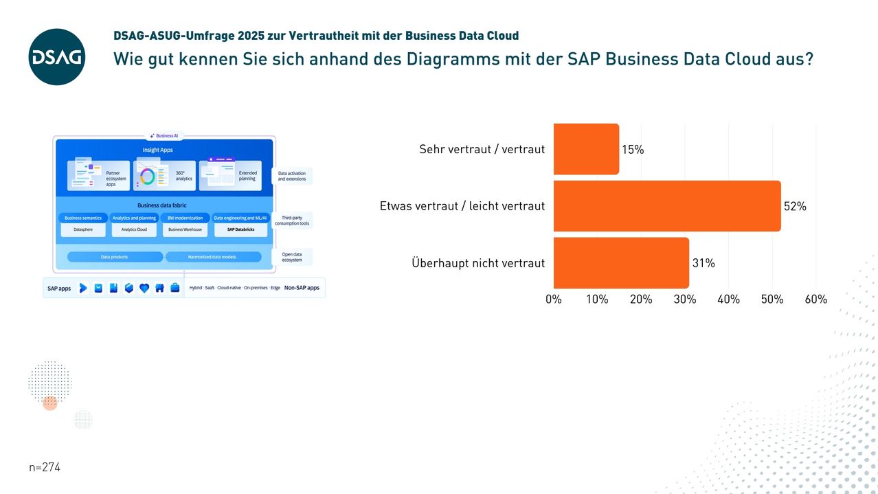 Befragt nach ihrem Wissen über die Business Data Cloud, gaben 15 Prozent an, sehr vertraut und vertraut zu sein (ASUG: 17 Prozent, UKISUG: 19 Prozent, JSUG: 11 Prozent). Einigermassen und leicht vertraut sind 52 Prozent (ASUG: 61 Prozent, UKISUG: 53 Prozent, JSUG: 66 Prozent). Gar nicht vertraut sind 31 Prozent (ASUG: 22 Prozent, UKISUG: 30 Prozent, JSUG: 22 Prozent). Bei den Wissenslücken über die Business Data Cloud belegen die ersten drei Plätze die Integrationsfähigkeit, die Lizenz- und Preismodelle sowie die Unterschiede zu früheren SAP-Datenlösungen. «Viele Unternehmen haben noch zu wenig Orientierung bei der Business Data Cloud. Darum erwarten wir von SAP mehr Transparenz», so Hungershausen.