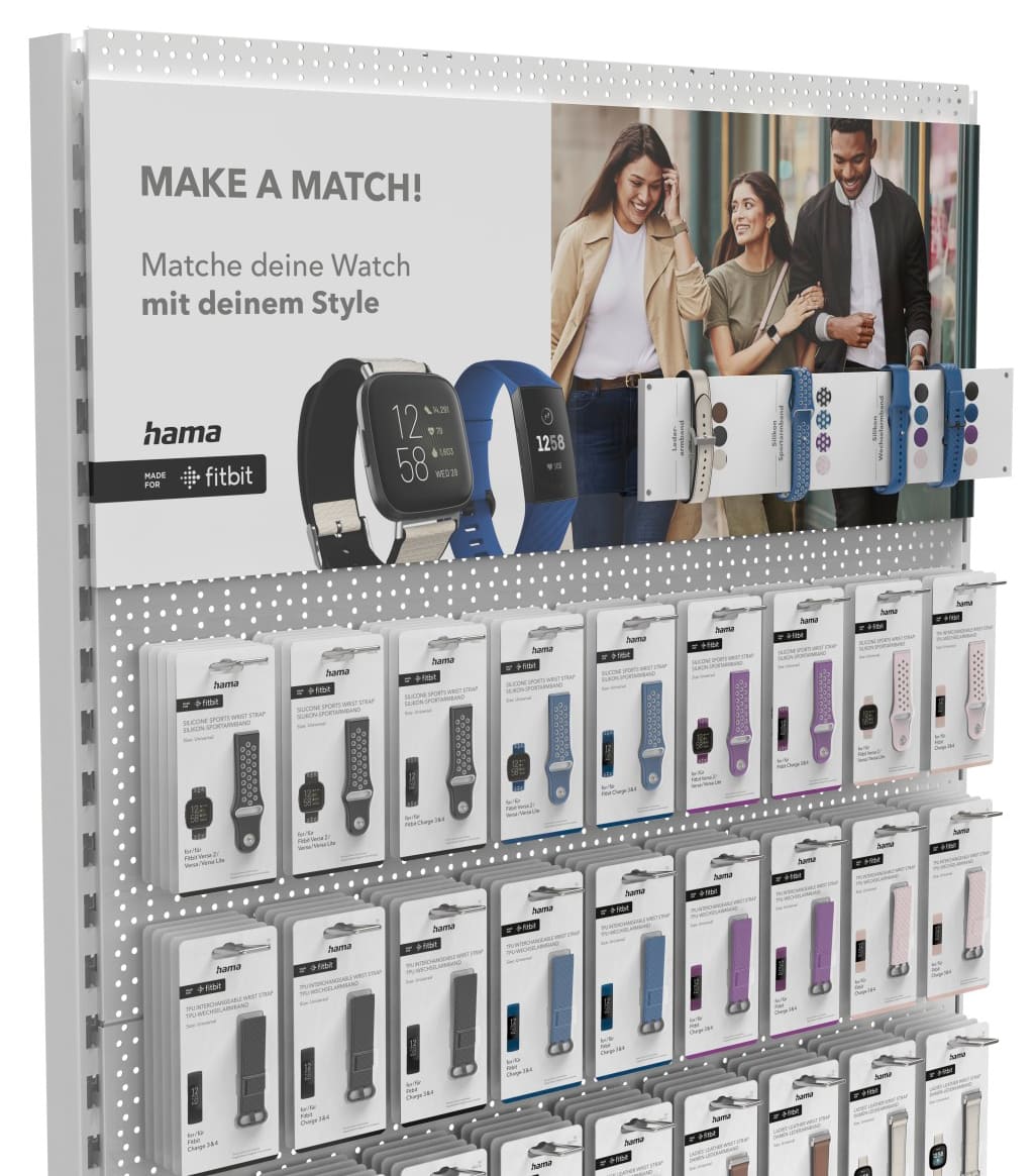 Die Ersatz- und Wechselbänder von Hama sind optisch an die Fitbit-Designs angelehnt, die Verpackung mit dem zusätzlichen Fitbit-Logo haben einen hohen Wiedererkennungswert. Für den PoS bietet Hama Theken- und Bodendisplays, Demoboards, Einhängetafeln und Wobbler für den Wandbehang