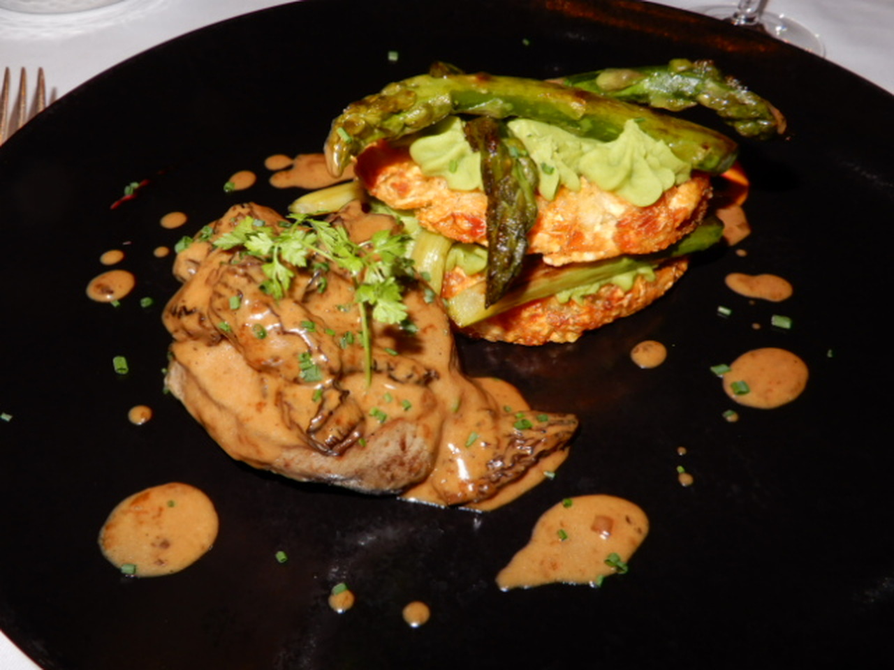 Rindsfilet an Morchelsauce, Rösti-„Millefeuille“, Crème kleiner Erbsen und grüne Spargelspitzen