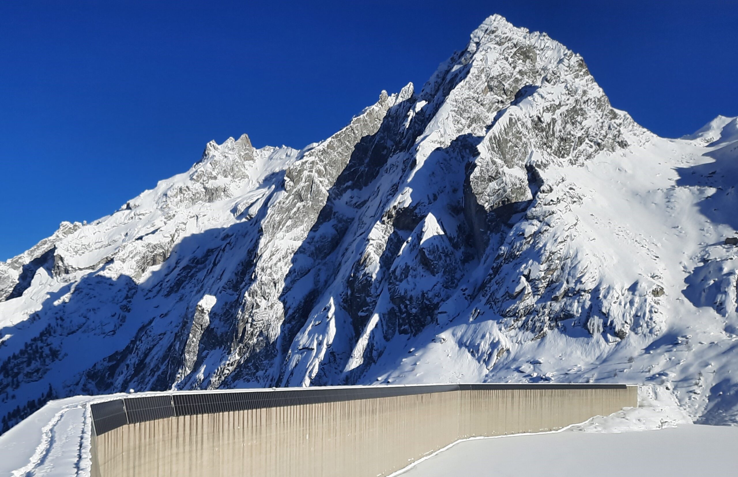 Im Sommer 2020 wurde die erste hochalpine Solar-Grossanlage der Schweiz auf rund 2’100 Metern über Meer installiert. Seitdem zieren 1200 Photovoltaik-Panels mit einer Länge von 670 Metern und einer Gesamtleistung von 410 Kilowatt Peak (kWp) die Albigna Staumauer im Bergell. Seit Mitte September ist die Anlage in Betrieb.