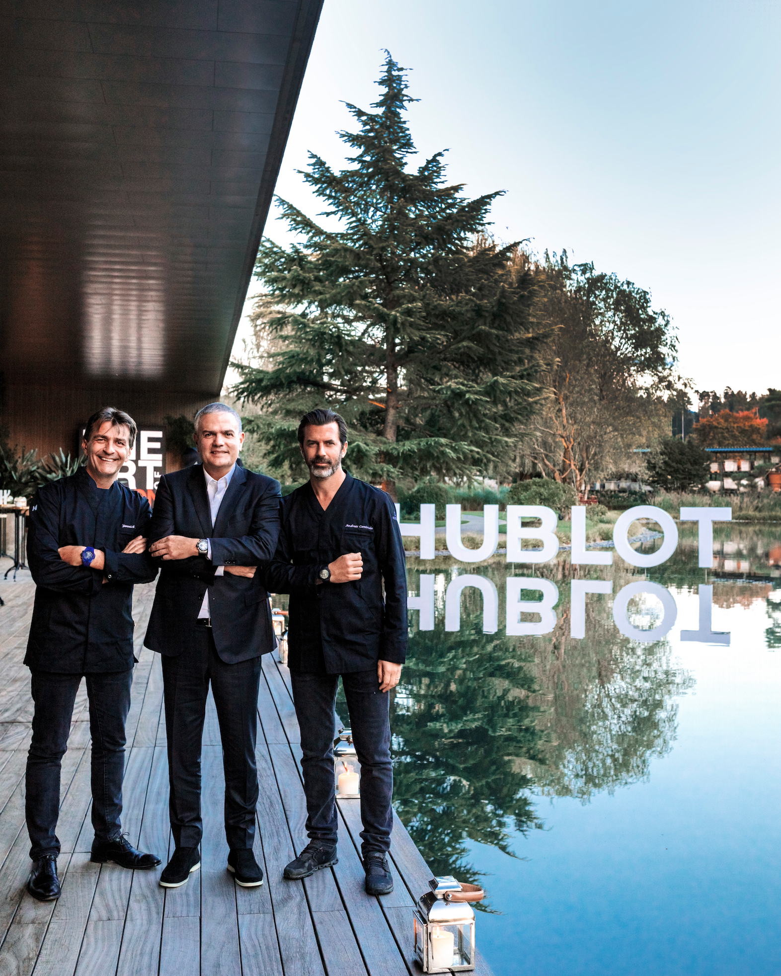 Hublot-CEO Ricardo Guadalupe inmitten der 3*-Spitzenköche Yannick Alléno und Andreas Caminada (Bild zVg)