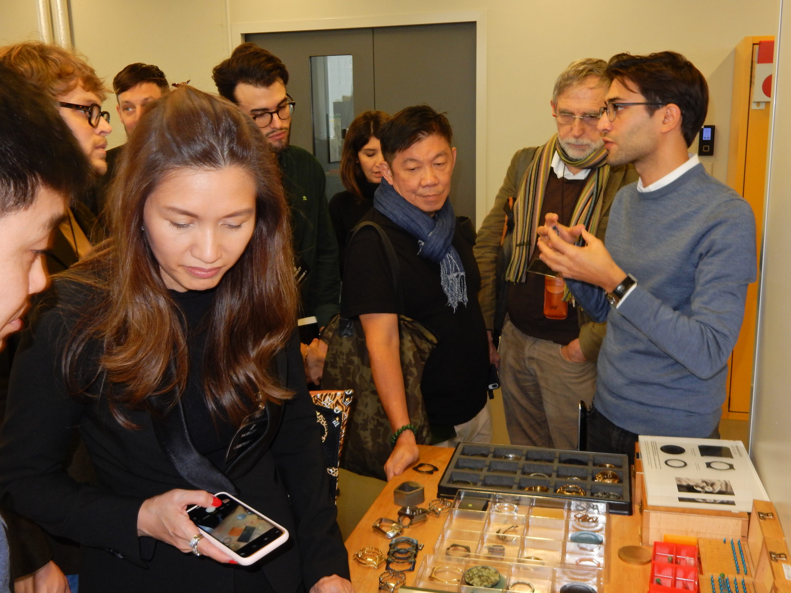 Ein Teil der geladenen Journalisten begutachtet einen der zahlreichen „Setzkästen“ zur Zusammenführung kleinster Uhren-Teilchen (Bild von jpr)