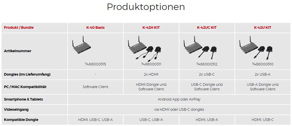 Bei der neuen K-40-Serie spricht Kindermann von einer universellen drahtlosen Präsentationlösung! Aber warum universell? Weil nun die Basiseinheit als Einzelstück (ohne Dongles) aber auch in den Set’s mit jeweils zwei Dongles USB-A, HDMI/USB-A und USB-C erhältlich sind. Somit stehen alle wichtigen Anschlüsse für eine drahtlose Bildübertragung zur Verfügung. Zudem ist die Basiseinheit immer dieselbe, was für den Händler wie auch Endkunden die Möglichkeit bietet, selber ein Set kundenspezifisch zusammenzustellen.