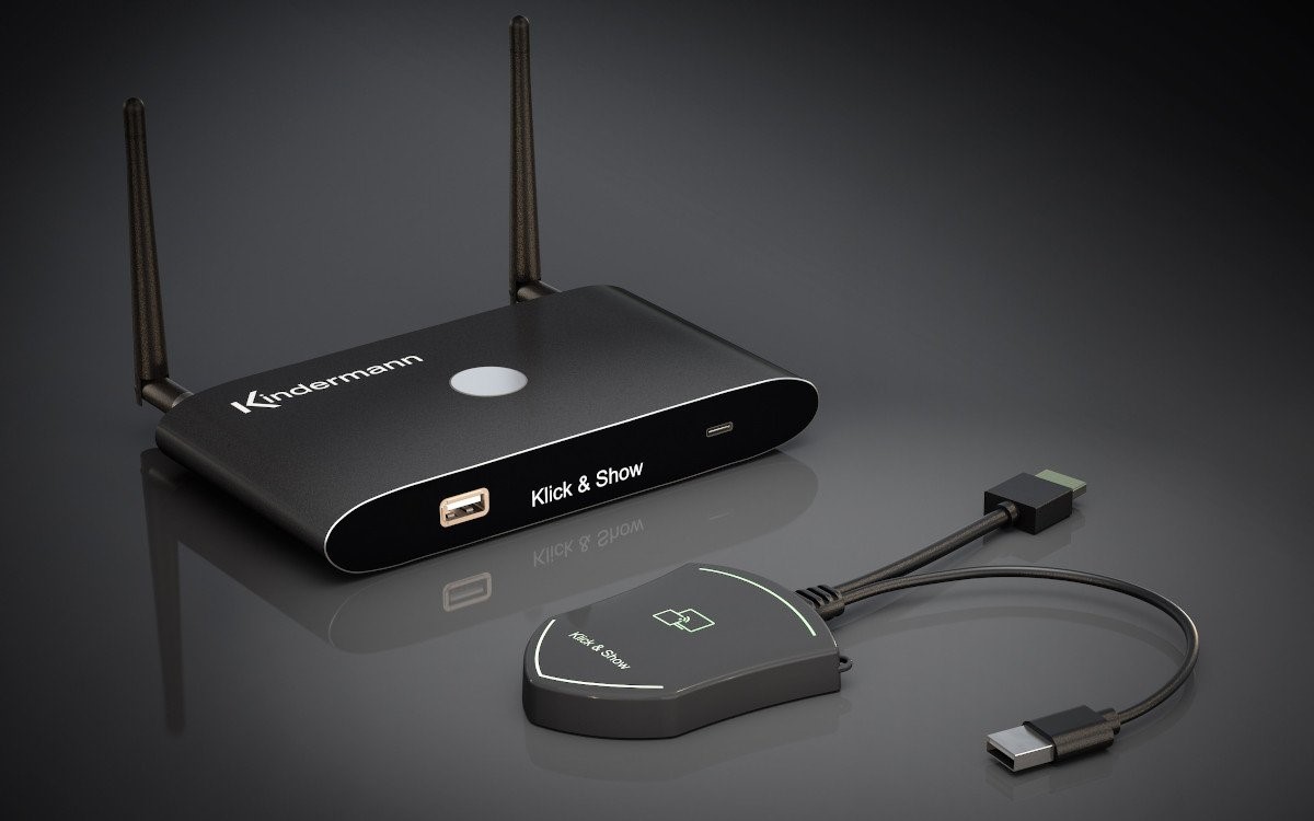 Mit dem Kindermann KLICK & SHOW Präsentationssystem können Inhalte von Laptops und Mobilgeräten besonders einfach drahtlos präsentiert werden – ganz ohne Konfiguration, ohne Kabel, ohne Treiber und ohne Wartezeiten.