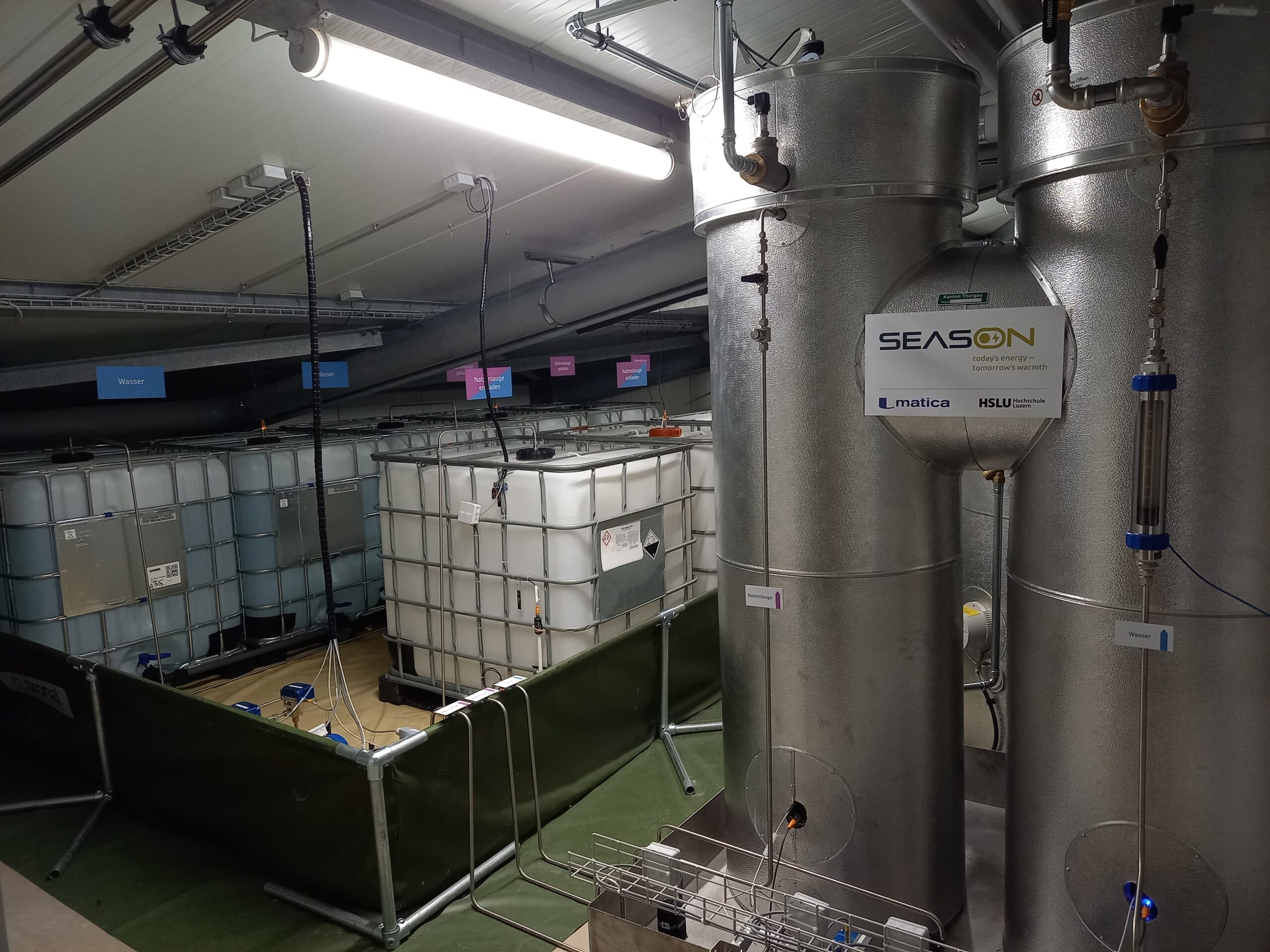 Als Speichermedium dient SeasON Natronlauge. Sie wird im Sommer mit überschüssigem Strom der PV-Anlage beladen, indem ihr das Wasser entzogen wird. Die so konzentrierte Natronlauge und das abgeschiedene Wasser lassen sich bei Raumtemperatur bis im Winter je in separaten Tanks speichern respektive lagern. Im Winter wird die konzentrierte Lauge mit dem abgeschiedenen Wasser wieder verdünnt. Konkret nimmt die Lauge das Wasser auf, das in dem geschlossenen System mit Hilfe von Niedertemperaturwärme verdampft wird. Der thermochemische Prozess setzt sowohl die Kondensationswärme des Wasserdampfes als auch die Mischungswärme bei erhöhter Temperatur frei. Der Massen- und Wärmetauscher arbeitetsomit als Sorptionsspeicher-Wärmepumpe (SSWP) und stellt praktisch ohne zusätzliche elektrische Energie Heizungswärme bereit. Der Speicherwirkungsgrad beträgt bis zu 95 Prozent.
