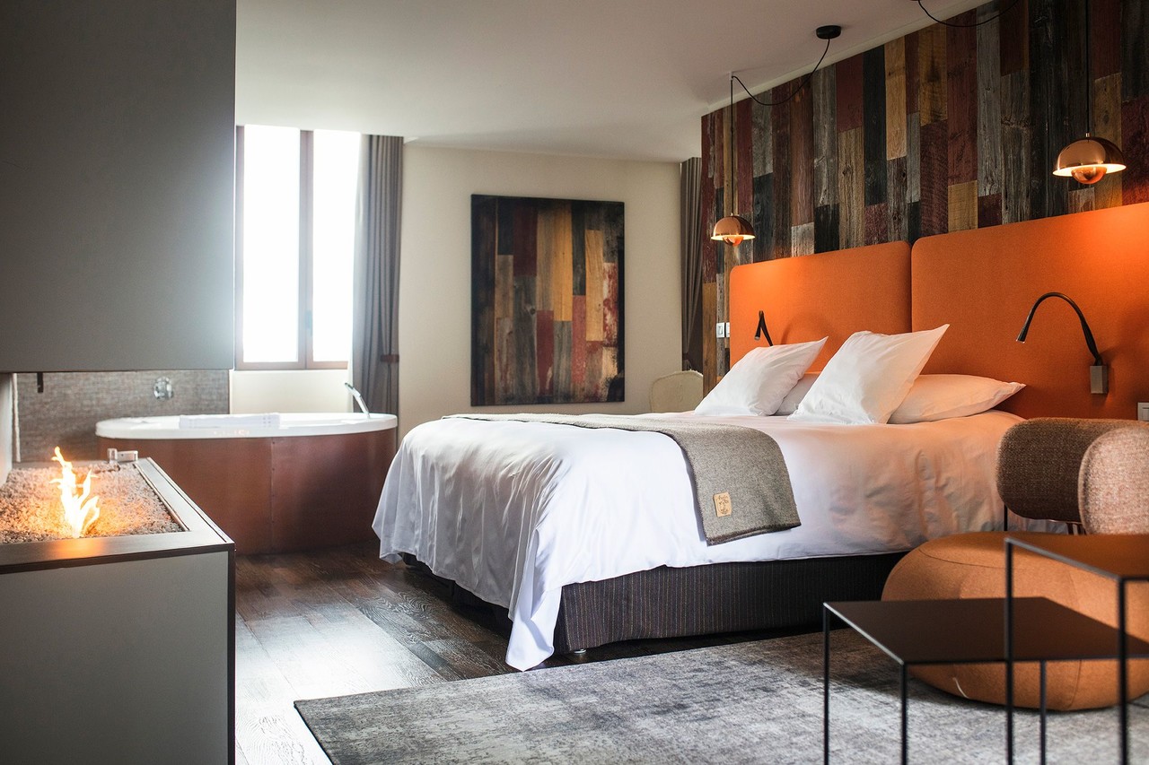 Eine ebenso edle, mit Jacuzzi & modernem Gas-Cheminée bestückte Junior Suite (Crédit photo Matthieu Cellard)