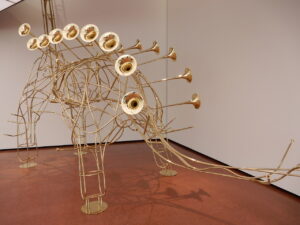 So ist etwa im weit ausladend selben 1. Stock des nunmehr imposanten Kunstgebäudes die nicht nur dank ihrer Höhe von 6,22 Metern hohe, aus 24 Posaunen geschaffene und in einer Ecke errichtet eindrückliche «Soundskulptur» nicht zu übersehen. Constantin Luser gestaltete diese «als weibliches Pendant zu seinem im Jahre 2008 entstandenen Vibrosaurus» aus poliertem Messing. Die Skulptur funktioniert nicht nur optisch, sondern auch akustisch dank ihrer Bespielbarkeit, mit welcher der vorerst visuelle Eindruck in eine hörbare Dimension transferiert werden kann und Betrachtende zu einem Teil des überzeugenden Kunstwerks werden lässt.