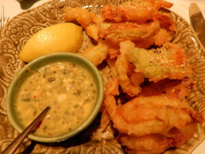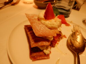 Dieses wird zunächst auf dessen Dachterrasse mit herausragend erfrischenden Cocktails zelebriert. Es sorgt für Pariser Flair inmitten von Wien und befindet sich hoch oben auf dem Dach eines historischen Gebäudes aus den 1870-er-Jahren. Für besondere Ambiance sorgen d’rinnen gemütliche Sitzecken, viel Grün sowie eine imposante Kuppel über der Bar, von welcher üppige Topfpflanzen von der Decke hängen. Zur Vorspeise bestellten zwei unserer Gruppe im Bierteig frittierte Zucchini-Blüten zu einer leichten Vinaigrette, was geschmacklich eine begeisternde Kombination ergab: Absolut empfehlenswert! Das nachfolgende Wiener Schnitzel aus dünn geklopftem Kalbfleisch vermochte hingegen nicht ganz zu überzeugen, da dessen Panade sich vorschnell und blättrig vom Kalbsschnitzel d’rinnen verabschiedete… Sehr lecker dann jedoch wiederum die «millefeuille» mit Erdbeeren des Hauses zum Dessert! Mithin ein höchst ansprechendes Etablissement aus Dachterrasse, Bar, grosszügig angeordneten Tischen, bei welchen niemand die anderen Gäste stört. www.hotelmotto.at/chez-bernard