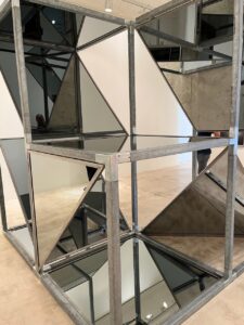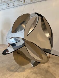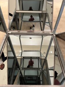 Unter dem Titel «Licht in der Dunkelheit» sprechen uns an Ort überdies die attraktiven «liminal spaces»-Gemälde von Eva Schlegelan, welche ideal mit dem Skulpturen von Van Lieshout des Ateliers selben Namens interagieren. Letztere begeistern mit reflektierenden, sich bei nahem Anblick in sich selbst vervielfachenden Skulpturen aus geschliffenem Metall und Glas: Besuchende können sich darin auf verschiedenen Betrachtungsebenen wiederfinden, werden aber auch vom Gefühl eingeholt, sich kurz vor Absturz ins Bodenlose zu befinden…
